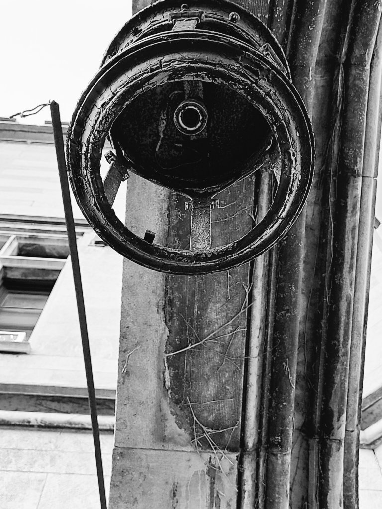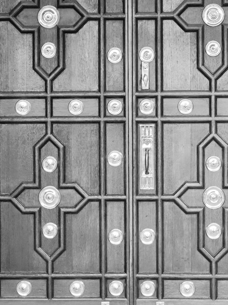 A locked Medieval door portraying all that is visible… Greyscaling ranges of gray that have no apparent color… Reflecting the light showing woodgrain and steel…
