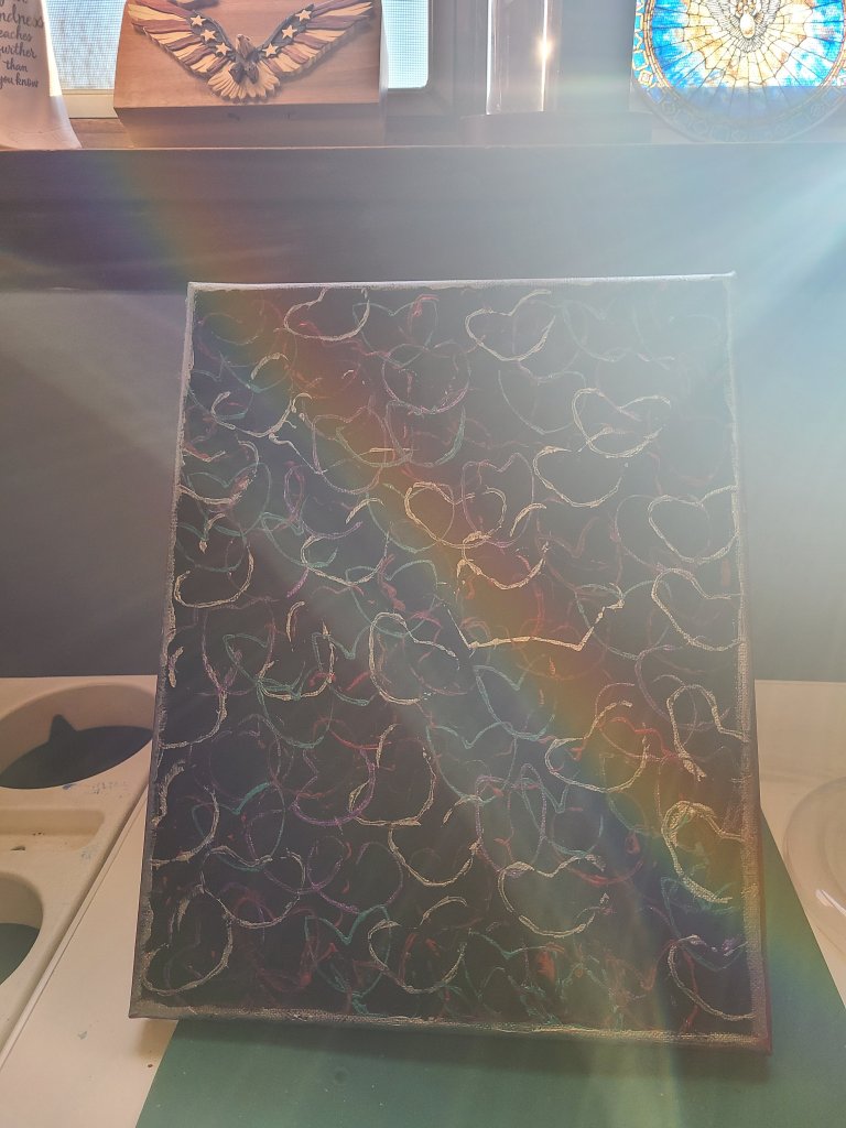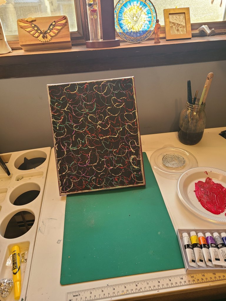 I happily drove away with this afternoon’s project. A painting of multicolored metallic hearts on canvas. With cello music playing in the background along with hammering of my husband’s cellar project. I thoroughly enjoy the creative process either on canvas or the written page.